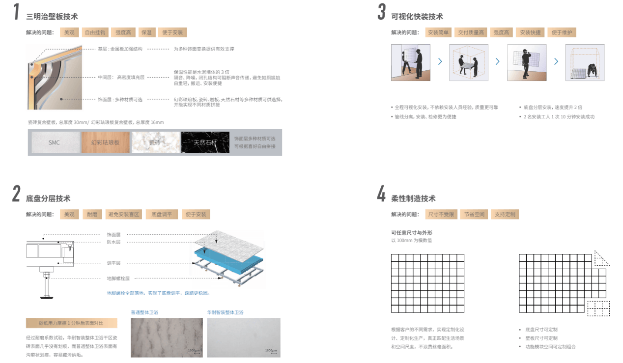 正在手艺实力方面,华耐智拆一直将手艺立异放正在首位,公司组建了研发团队,专注于拆卸式内拆手艺的摸索取冲破。研发出底盘分层手艺,通过科学的分层设想,隔音和承沉能力;可视化快拆手艺则实现了以制制逻辑办理现场施工,目前,华耐智拆产物已累计获得60 余项专利,手艺实力外行业内处于领先地位。正在手艺引领上,其不竭推出的立异手艺和产物,为行业树立了标杆。正在尺度制定上,华耐智拆积极参取国内全体卫浴和工业化内拆相关行业尺度的编制,将本身的实践经验和手艺融入尺度中,帮力行业向规范化、尺度化标的目的成长。正在市场培育上,通过优良的项目案例和优良的市场口碑,提拔了拆卸式内拆正在社会中的承认度,扩大了市场使用范畴,为行业的持续成长注入了强劲动力。