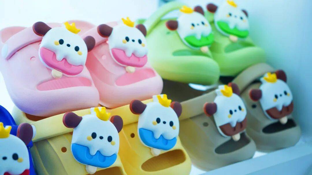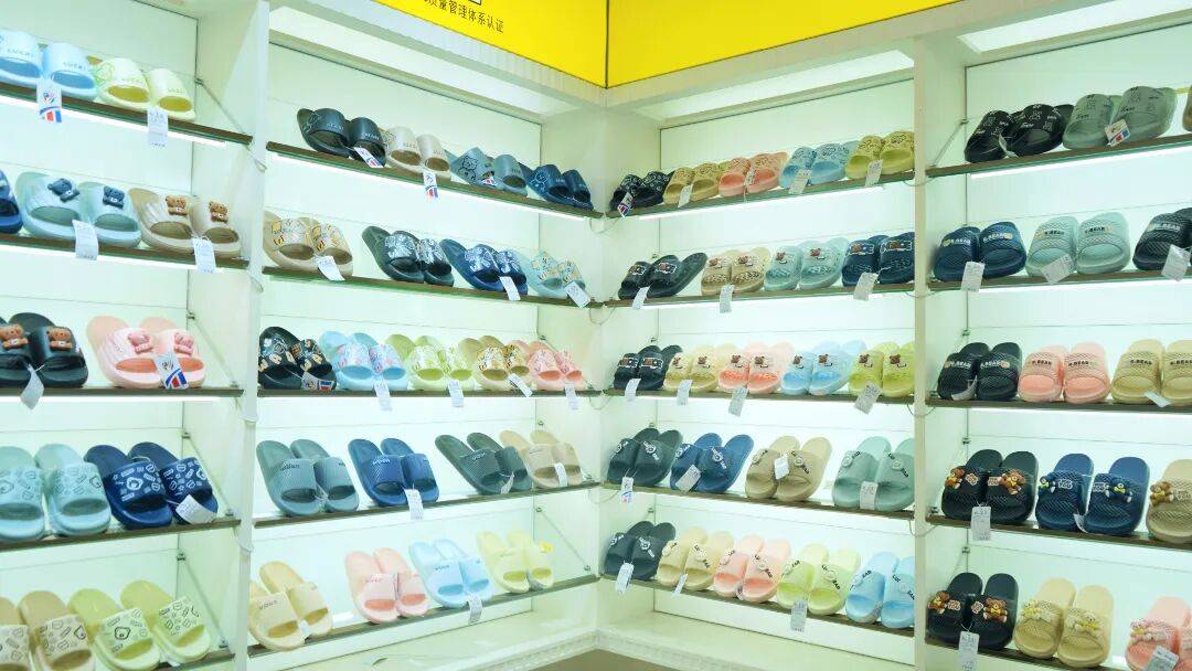 刚踏入顺通鞋业的展厅,仿佛来到了一个微缩全球鞋业博览会。从典范适用的人字拖、洞洞鞋,到设想新鲜的厚底拖鞋、功能型浴室拖鞋,数百款鞋品参差有致地陈列正在展架上。