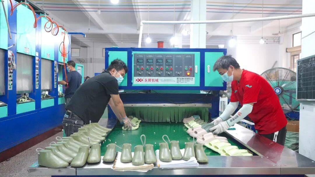 严冬时节,北方多地冰雪未消,而正在千里之外的“中国塑料鞋之都”湛江吴川,位于博铺街道的塑料鞋出产车间内倒是一派火热气象。一条条EVA出产线高速运转,工人们将原料注入模具,几分钟后,一双双具备高弹、耐磨、防滑等特征的塑料鞋慢慢下线,即将发往国表里市场。